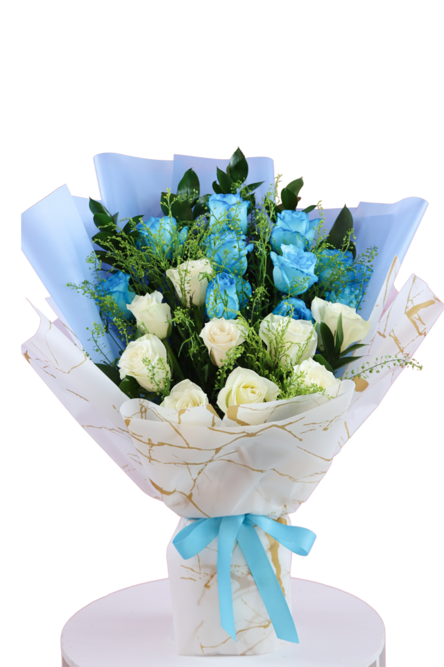 This striking bouquet featuring a mix of vibrant blue and white roses accented by delicate green foliage. The flowers are elegantly wrapped in marbled white paper and soft blue inner wrapping tied with a matching blue ribbon, creating a visually appealing and contemporary display.